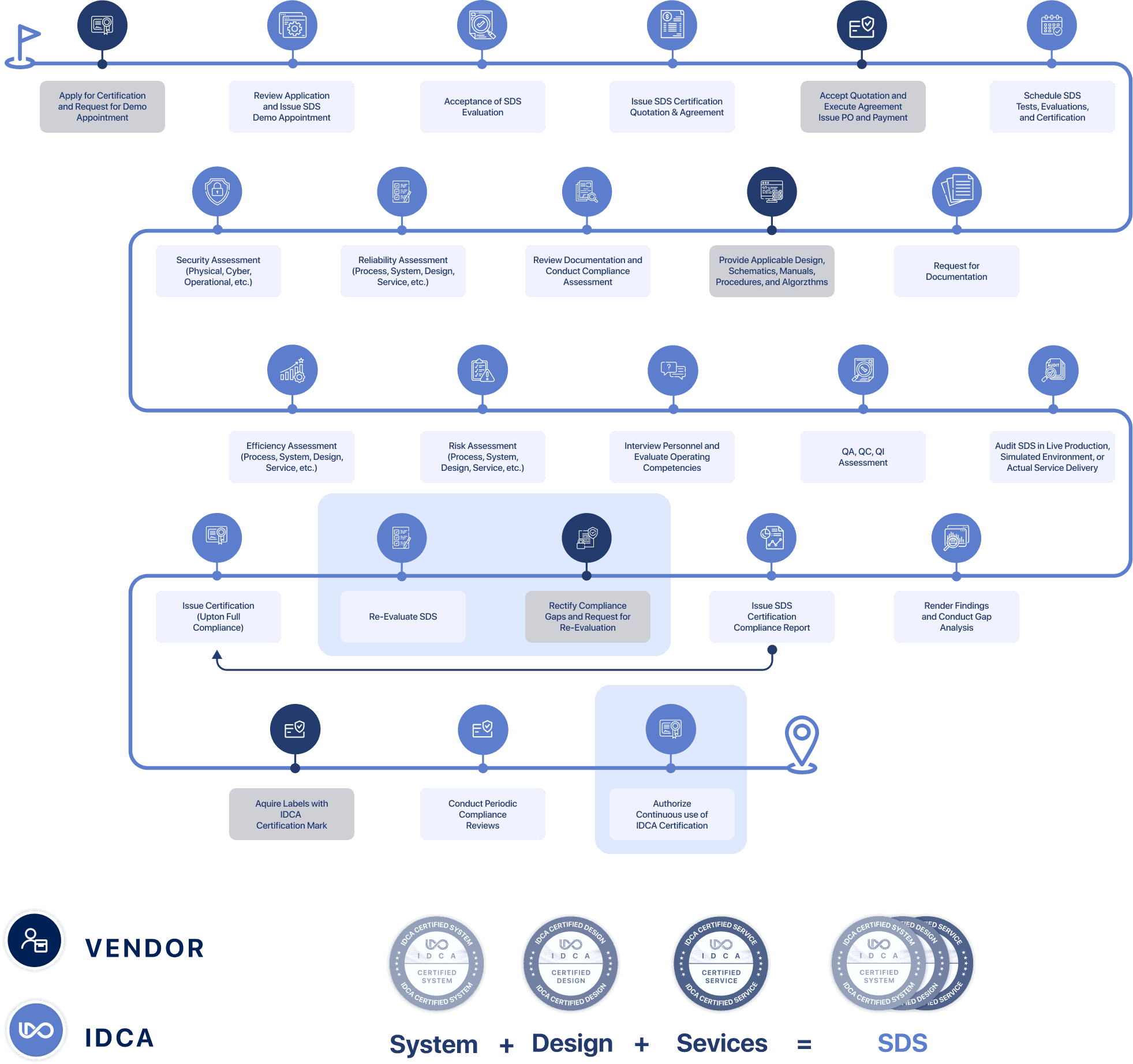 IDCA SDS (System, Design, Service) certification is intended to validate the interoperability of a complex system, design, or service with complex and mission-critical environments and certify their application and use case per the critical level, scale, and scope of the environment their provider aims to serve.