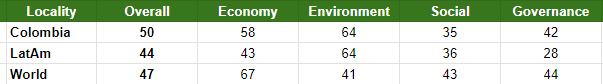Colombia ranks in the upper one-third of all the nations of the world, and fifth within Latin America (trailing Chile, Uruguay, Costa Rica, and Brazil). Colombia's digital infrastructure is relatively strong by Latin American standards, and today faces a key opportunity to progress more quickly toward a developed-world standard. Its relatively massive use of hydropower gives it a renewable electricity grid percentage that's more than twice the world average. Its social and governance factors exceed the Latin American average.